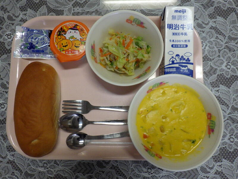 一覧へ ハロウィン献立 日時 2025年10月31日(金) 公開対象 今日の給食 詳細 本日の給食は「ハロウィン献立」でした。ハロウィンにちなんで,かぼちゃを使ったメニューが出されました。 かぼちゃには,「若返りのビタミン」とも呼ばれるビタミンEや,皮膚や目を健康に保ってくれるカロテンなどが含まれているそうです。栄養たっぷりのかぼちゃを食べて,ハロウィンを楽しみましょう! コッペパン ブルーベリージャム かぼちゃのシチュー ゆで野菜 パンプキンババロア 牛乳 作成者 陽南小学校管理者 更新日時 2025-10-31 12:45:17