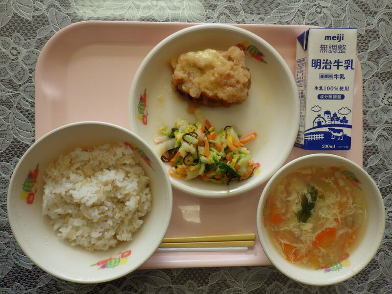 一覧へ 今日の給食 日時 2025年12月16日(火) 公開対象 今日の給食 詳細 麦入りごはん ハンバーグ おろぽんチーソース 塩昆布あえ 洋風たまごスープ 牛乳 作成者 陽南小学校管理者 更新日時 2025-12-16 14:51:28