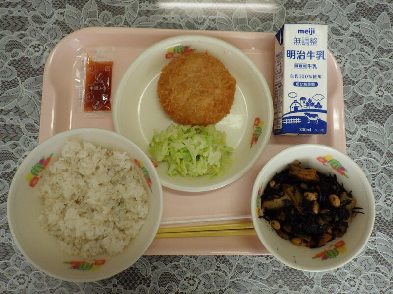 一覧へ 今日の給食 日時 2025年10月27日(月) 公開対象 今日の給食 詳細 麦入りごはん ハムカツ(ソース) ボイルキャベツ ひじきと大豆のいり煮 牛乳 作成者 陽南小学校管理者 更新日時 2025-10-27 12:18:45