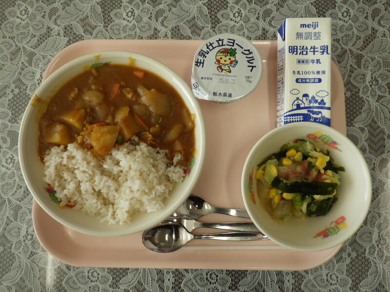 一覧へ 今日の給食 日時 2025年10月10日(金) 公開対象 今日の給食 詳細 麦入りごはん ポークカレー こんにゃくサラダ(和風ドレッシング) ヨーグルト 牛乳 作成者 陽南小学校管理者 更新日時 2025-10-10 12:26:26