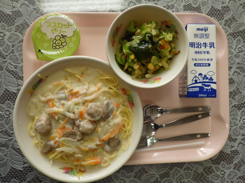 ミートボール入りクリームソーススパゲッティ 海藻サラダ(青じそドレッシング) マスカットゼリー 牛乳