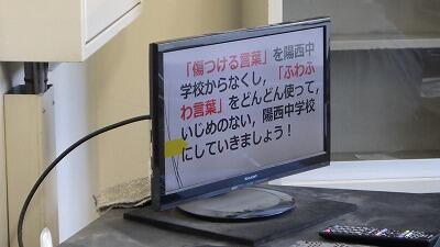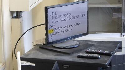 11月10日(月)TV放送で、今年度2回目となる「いじめゼロ集会」が行われました。「人を傷つけることば」について、各学級や学年委員会で話し合い、各学年委員長がテレビ画面を通じてそのまとめを発表しました。一人一人が今の現状を把握し、改善するための取組を再確認する大切な機会となりました。