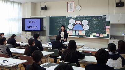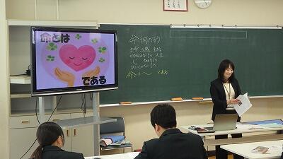 本校の重点目標として①「感謝」「思いやり」の心を持ち、謙虚に学ぶ広い心を持つ生徒の育成 ②生命の尊さを知り、自他の生命を尊重する心の育成』を掲げています。教育活動を通して「心の教育」を実践し、生徒のよりよい生き方につなげていくことを目指しています。