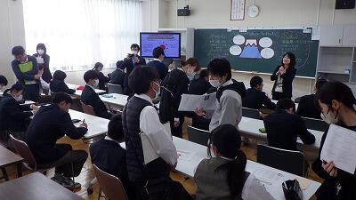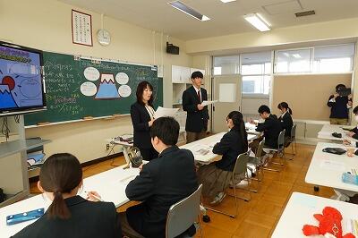 生徒の学ぶ姿や教員の授業する姿はKeep going・生きる~一生懸命はかっこいい~の体現につながっています。本校教諭3名が研修の一環として、ICTを活用した授業を実践しました。社会科、保健体育科、技術科の3教科でICTをどの場面で使用するか、その活用の意図は何かなどをふまえ、生徒の学習活動を計画し、生徒にとって分かりやすい授業展開になるよう努め、本時の目標達成に取り組みました。生徒たちは限られた時間の中で、進んで調べ学習したりプログラミングを試作したりして問題解決する力を発揮していました。