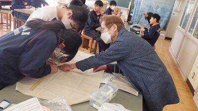 1年生の家庭科の授業では、地域のボランティアの皆様にお越しいただき、ミシンの実技指導を支援していただいています。生徒たちはボランティアの方々に優しくサポートしていただきながら、裁縫の工程を一つずつ丁寧に確認し、真剣な表情でミシンを動かしていました。地域の方々と交流しながら、技術を習得していく貴重な学びの時間となっています。