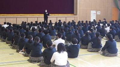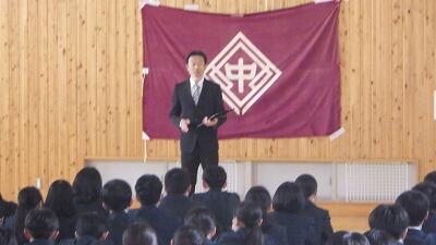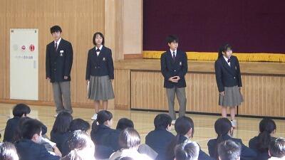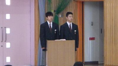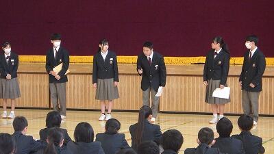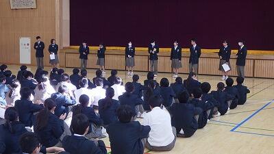 10月29日(水)1学年と3学年が朝会を行いました。両学年とも各クラスの後期学級委員が自己紹介するとともに抱負を述べました。また、1学年の学級委員は人とのかかわりを大切にするため、ふわふわ言葉を発表しました。今回の学年朝会を通して「優しさや思いやり」「言葉の大切さ」「テストや進路に向かう」「冬季に向けての服装」など、学習や生活そして人とのかかわり方を意識して過ごすことを再確認しました。それぞれの学年とも目標に向かって「Keep going・生きる~一生懸命はかっこいい~」潤いと活力あふれる学校にしていきましょう。