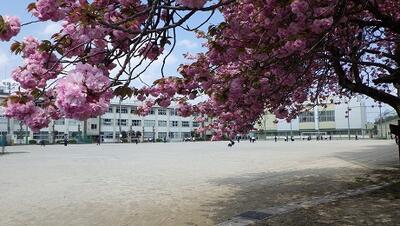 校庭の八重桜(牡丹桜)が満開です。