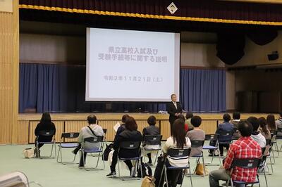 10時40分から体育館で第3学年の保護者を対象として,県立高等学校入試説明会を行いました。