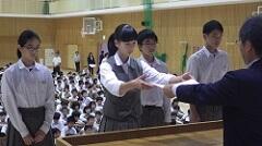 まず、初めに美化コンクールの表彰が行われました。優勝したクラスには黄金色に塗装された黒板消しが贈られました。今後も、校内美化の意識を高く保ち、きれいな環境を整えていってほしいと思います。