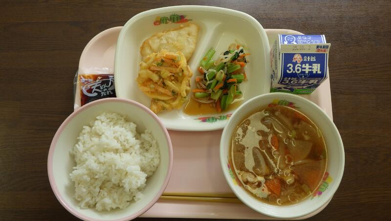 〈麦入りごはん セルフ天丼(野菜かき揚げ・白身魚) 牛乳 おひたし 吉野汁〉