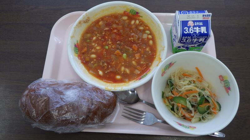 〈シュガー揚げパン(黒糖パン) 牛乳 チリコンカン 春雨サラダ〉