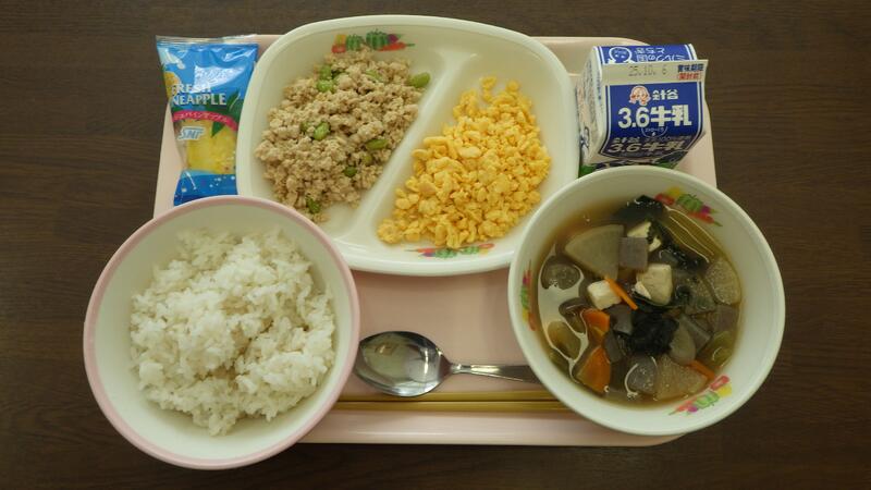 〈麦入りごはん セルフ二色丼 牛乳 けんちん汁 冷凍パイン〉