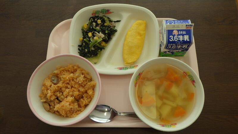 〈チキンライス 牛乳 チーズオムレツ 小松菜とハムのソテー ポテトスープ〉
