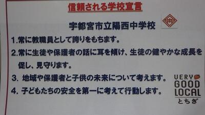 最後に校内で作成した「信頼される学校宣言」陽西中を全員で唱和して研修を終えました。