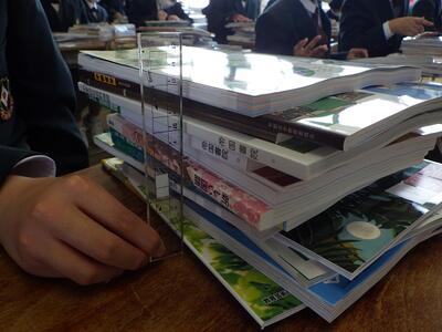 1年生は教科書が配られ、積みあがった高さは14㎝に・・・・。すべて持ち帰る指導はしていません。予習復習など家庭学習で必要な教科を自己判断で選別して持ち帰ります。