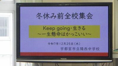 12月17日(水)、テレビ放送にて表彰を行いました。大会やコンクール等において「Keep going・生きる ~一生懸命はかっこいい~」のスローガンを体現し、素晴らしい成績を収めることができました。日頃の積み重ねが、大きな成果となって表れました。この喜びを糧に、今後もさらなる高みを目指して成長し続けていくことを期待しています。