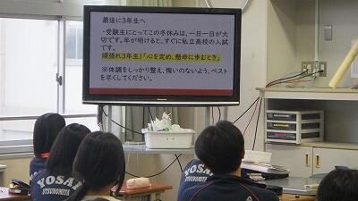 12月24日(水)、体育館にて高校受験事前指導を行いました。 いよいよ年が明けると、3年生は私立高校の入学試験に臨みます。この時期は誰もが必ず迎える人生の大きな節目であり、期待と不安が入り混じる時期でもあります。