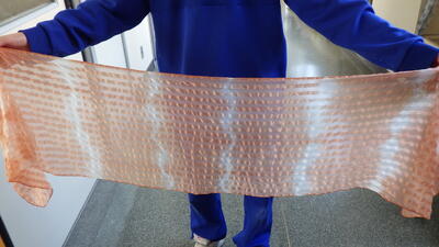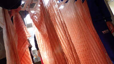 特別支援学級では,「蓮」でお世話になっている印南洋造様をお招きして,桜の木を煮出し「草木染」に挑戦しました。春を感じさせる色合いができましたにっこりこれはシルク生地です