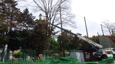 市教育委員会の委託業者の方々がネットの補修を行っています。ありがとうございます