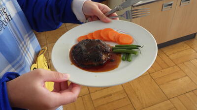 おいしい匂いに誘われると,家庭科の授業でハンバーグを作っていました。ぜひ,自宅でも挑戦してください