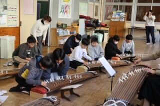 6年生オープンスペースにはずらりと琴が並びました。