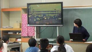 担任は自分の経験した震災について,写真を交えて子供たちに伝えました。
