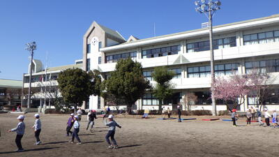 校庭で遊ぶたくさんの子供たち。見守る校舎。