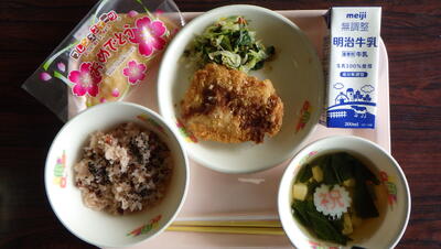 五目ちらし寿司 豆腐入り澄まし汁 アジのネギみそ焼き からし和え 牛乳 そして ひなあられ!