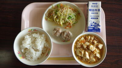 今日の献立は 麦入りごはん 牛乳 ポークシュウマイ 麻婆豆腐 バンサンスウ でした。