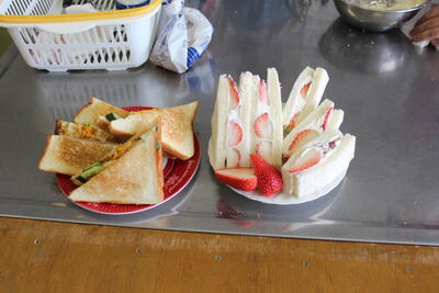 つやつやのいちごを使ったイチゴサンドと きゅうり・ハム・目玉焼きのサンドイッチです。