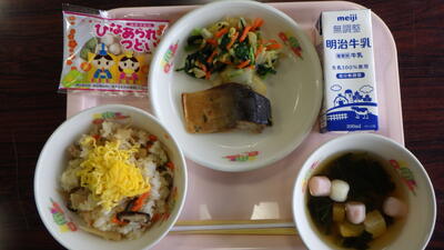 五目ちらし寿司 豆腐入り澄まし汁 アジのネギみそ焼き からし和え 牛乳 そして ひなあられ!