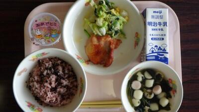 「赤飯 お祝いすまし汁 ゆで野菜 鶏肉のみそ漬け焼き お祝いゼリー」でした。