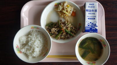 「麦入りごはん 牛乳 豚肉と宮野菜いため かんぴょうのごま酢和え 春野菜みそ汁」