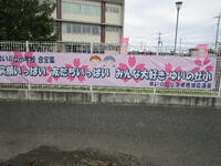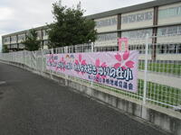 ゆいの杜小の合い言葉「笑顔いっぱい 友達いっぱい みんな大好き ゆいの杜小」の横断幕を
