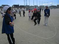 3年生が長縄を楽しんでいるところに,4年生,そして1年生が加わり,