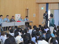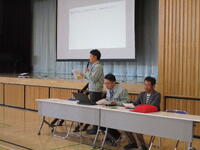 5年生が体育館で,JAの方や梨農家の方にお話を伺いました。