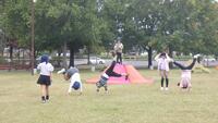 4年生のダンスでは,カラフルな旗がリズムに合わせて校庭を彩っていました。